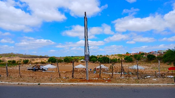 Foram instalados 6 (seis) postes, a fiação subterrânea já foi concluída, e a empresa está preparando os refletores para montagem nos postes.