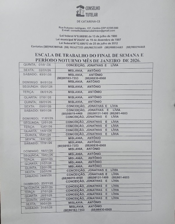 Escala de Trabalho do Conselho Tutelar de Catarina, mês de janeiro de 2026