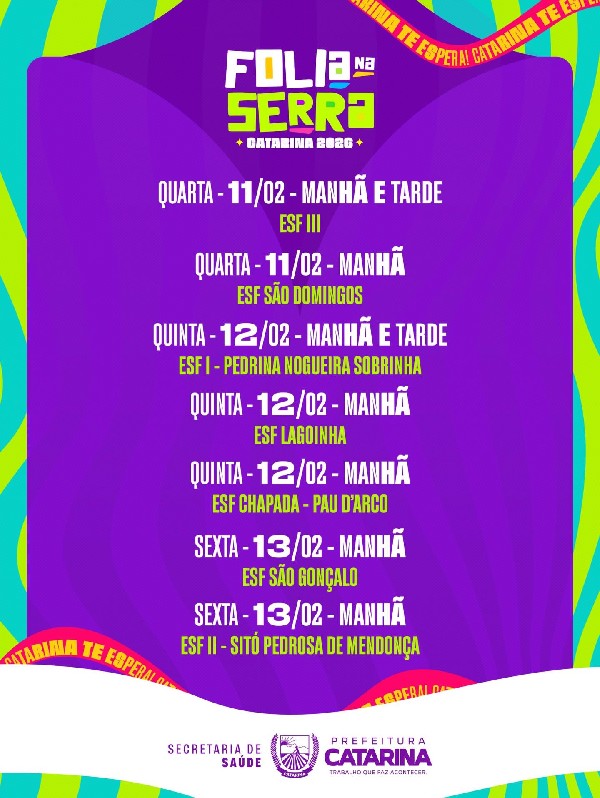 Antes de cair na festa, cuide da sua saúde. A Prefeitura de Catarina, por meio da Secretaria de Saúde, vai realizar testes rápidos gratuitos em todas as Unidades de Saúde para: HIV, Sífilis, Hepatite B e C.