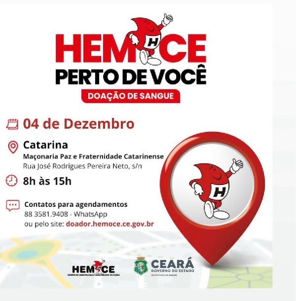 Hemoce perto de você! Doação de sangue em Catarina, dia 04/12.