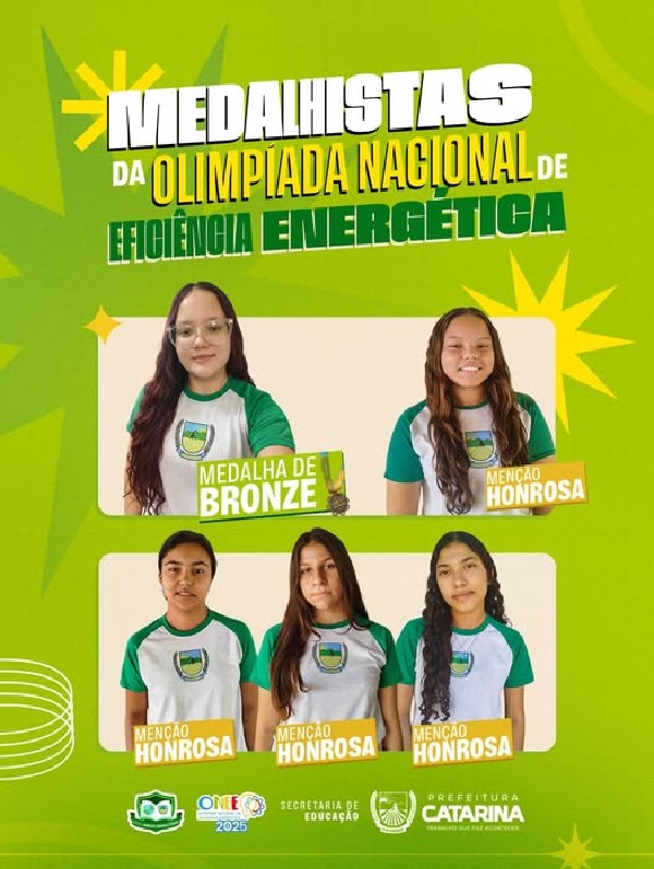 As estudantes da rede municipal de Catarina brilharam na Olimpíada Nacional de Eficiência Energética 2025, conquistando Medalha de Bronze e Menções Honrosas em uma das competições mais importantes do país.