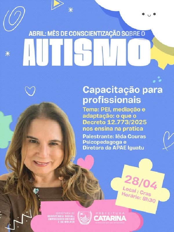A Prefeitura de Catarina, por meio da Secretaria de Assistência Social, realizará uma capacitação voltada para profissionais, abordando temas fundamentais para a inclusão e o atendimento de qualidade.